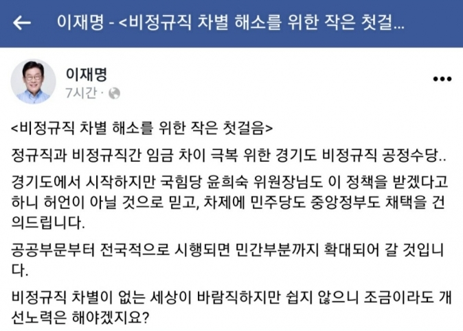 이와관련, 이재명 경기지사는 이날 자신의 사회관계망서비스(SNS)에 올린 '정규직 차별 해소를 위한 작은 첫걸음'이라는 글에서 "경기도에서 시작하지만 국민의힘 당 윤희숙 위원장님도 이 정책을 받겠다고 하니 허언이 아닐 것으로 믿고, 차제에 민주당도 중앙정부도 채택을 건의드린다"고 밝혔다.