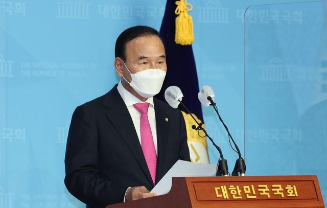 ▲ 국회 국토교통위원회 소속 당시 가족 명의 건설회사를 통해 피감기관들로부터 수천억 원대 공사를 특혜 수주했다는 의혹에 휩싸인 국민의힘 박덕흠 의원이 21일 국회 소통관에서 해명 기자회견을 하고 있다. [뉴시스]
