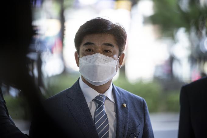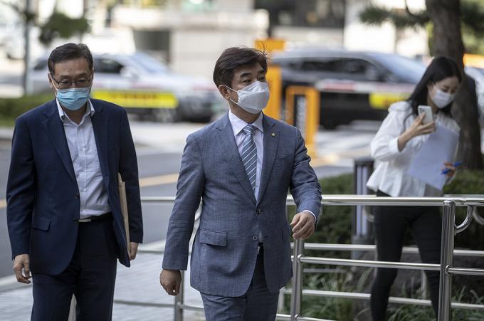20대 국회 패스트트랙 충돌 사태로 기소된 더불어민주당 김병욱 의원이 23일 오후 서울 양천구 남부지방법원에서 열린 첫 공판에 출석하고 있다.