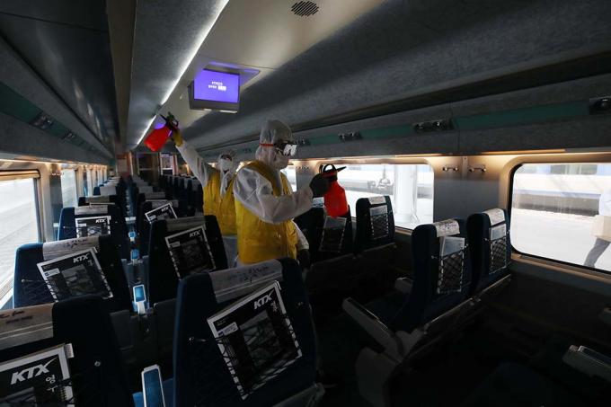 ▲ 추석 연휴를 하루 앞둔 지난달 29일 오전 서울 용산구 서울역에서 코레일 직원들이 추석 연휴 코로나19 확산 방지를 위한 방역 작업을 하고 있다. [정병혁 기자]