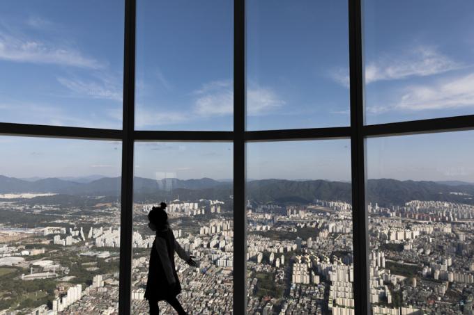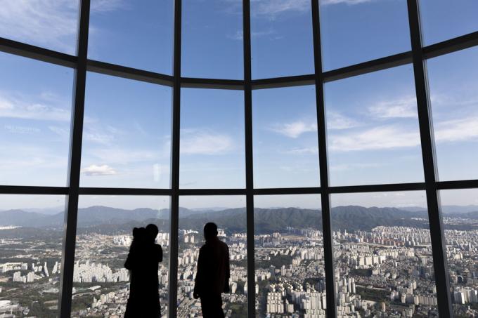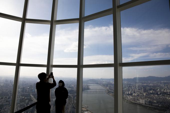 완연한 가을 날씨를 보인 5일 오후 서울 롯데월드타워 전망대 서울스카이에서 마스크를 착용한 시민들이 파란 하늘을 바라보고 있다.