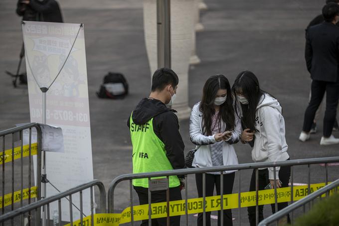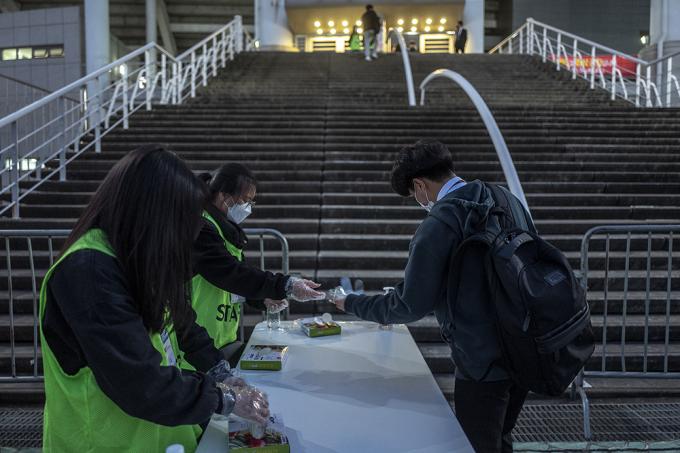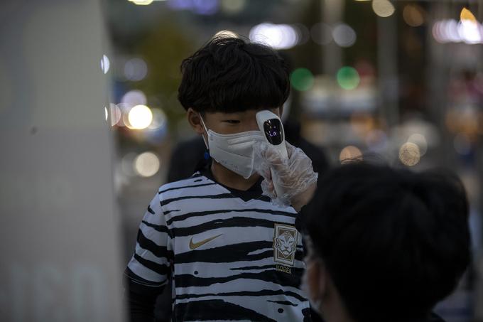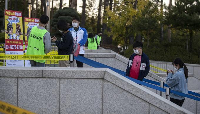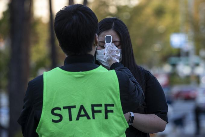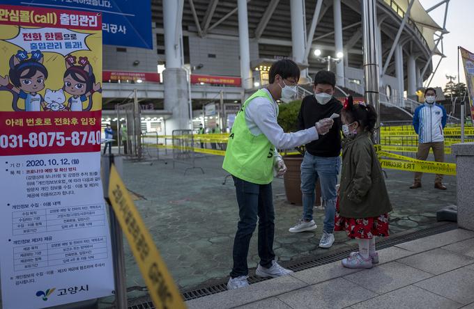 12일 오후 경기도 고양시 고양종합운동장에서 열린 '2020 하나은행컵 축구국가대표팀과 올림픽대표팀 친선경기' 2차전 경기를 찾은 관중들이 거리를 두고 체온 검사를 받으며 입장하고 있다. 정부는 12일부터 사회적 거리두기 1단계 완화로 스포츠 경기에 대해 인원을 제한하며 관중 입장을 허용하기로 했다.