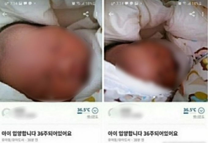 서귀포시 지역 카테고리에 올라온 해당 게시물에는 '아이 입양합니다. 36주 되었어요'라는 글과 함께 아이가 자는 모습이 담긴 사진 2장이 올라왔다. 20만 원의 가격도 제시됐다.