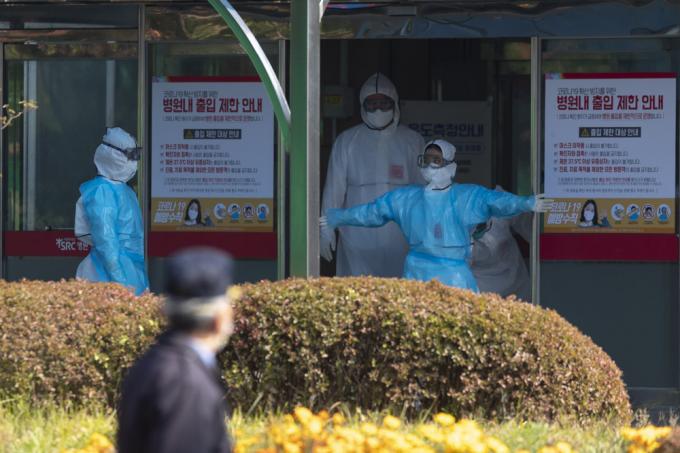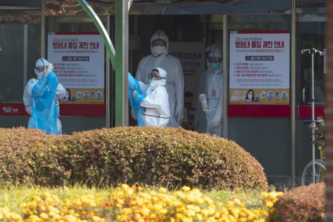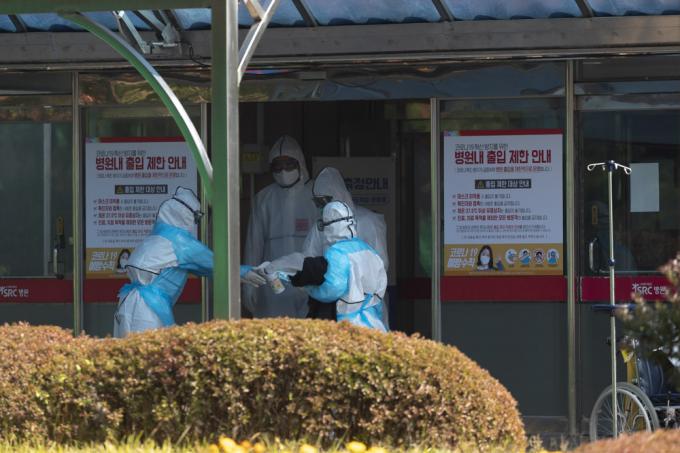 경기 광주 SRC재활병원 관련 코로나19 확진자가 19일 오전 기준으로 2명 추가돼 누적 53명으로 확인된 가운데, 이날 해당 병원에서 방역복을 입은 의료진들이 분주하게 움직이고 있다.