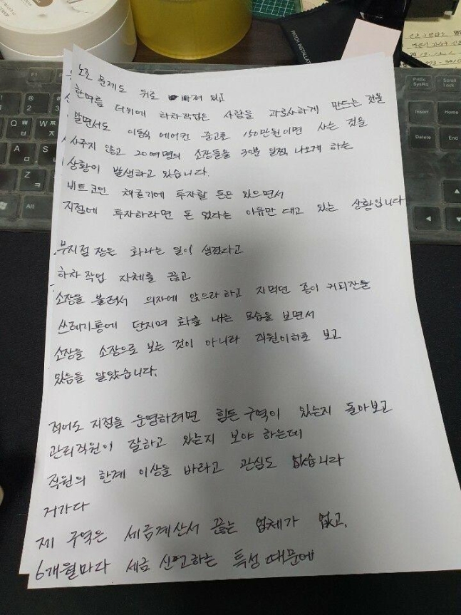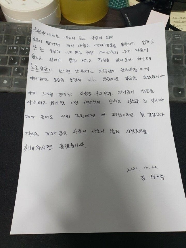 김 씨는 유서 말미에 "제가 죽어도 관리 직원에게 다 떠넘기려고 할 것"이라며 "다시는 저와 같은 사람이 나오지 않게 시정조치를 취해주면 좋겠다"고 썼다.