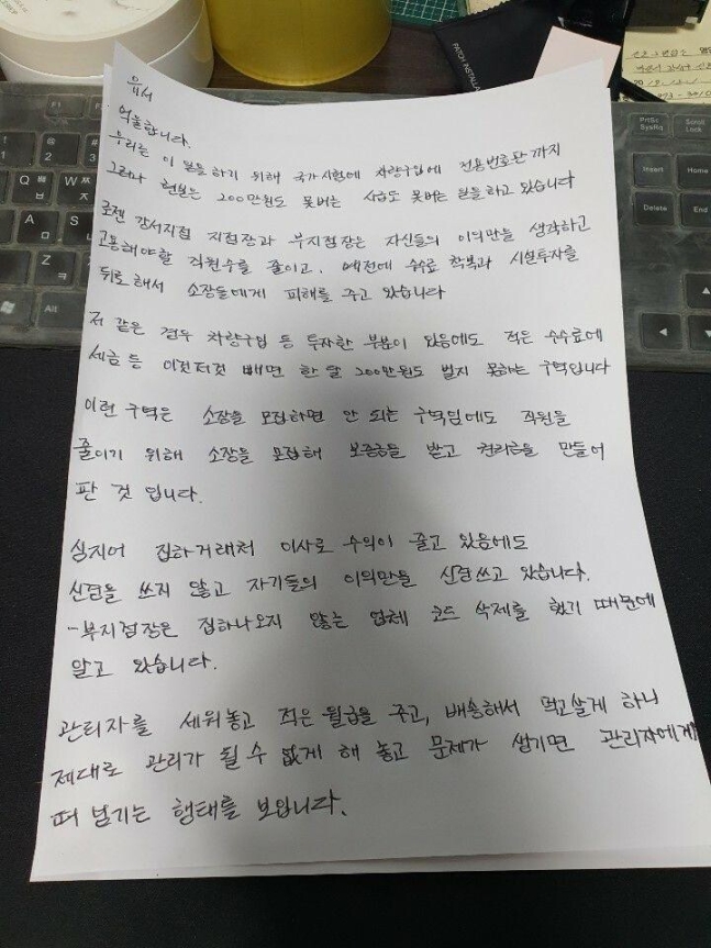이어 "한여름 더위에 하차 작업은 사람을 과로사하게 만드는 것을 알면서도 이동식 에어컨 중고로 150만 원이면 사는 것을 사주지 않았다. (오히려) 20여 명의 소장들을 30분 일찍 나오게 했다"고 대리점의 갑질을 지적했다.
