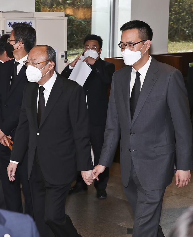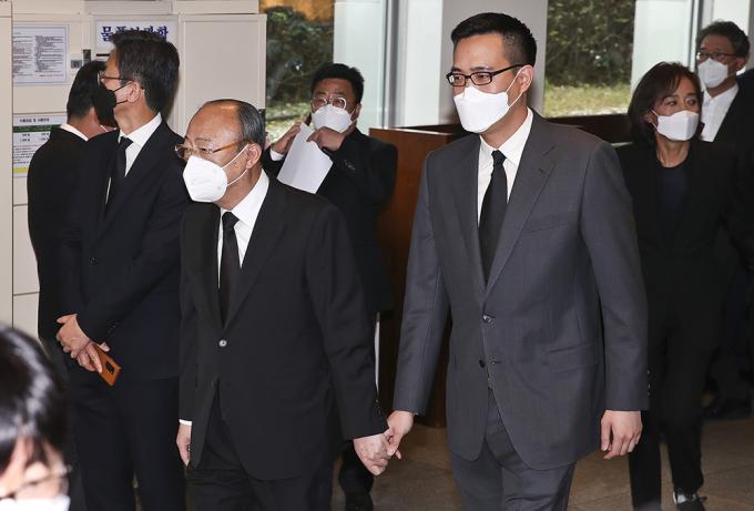 김승연 한화그룹 회장(왼쪽)과 아들 김동선 전 한화건설 팀장이 26일 오후 서울 강남구 삼성서울병원 장례식장에 마련된 고 이건희 삼성전자 회장의 빈소에서 조문을 마친 뒤 자리를 나서고 있다.