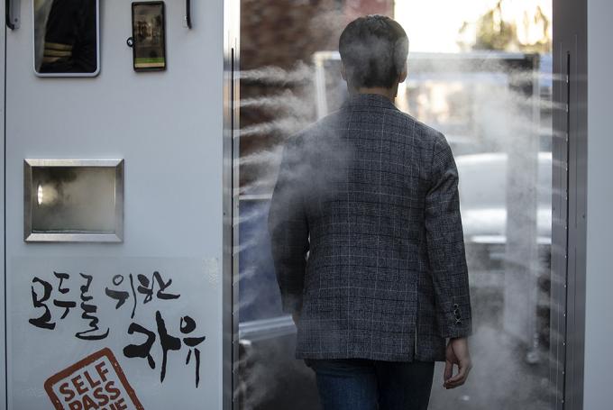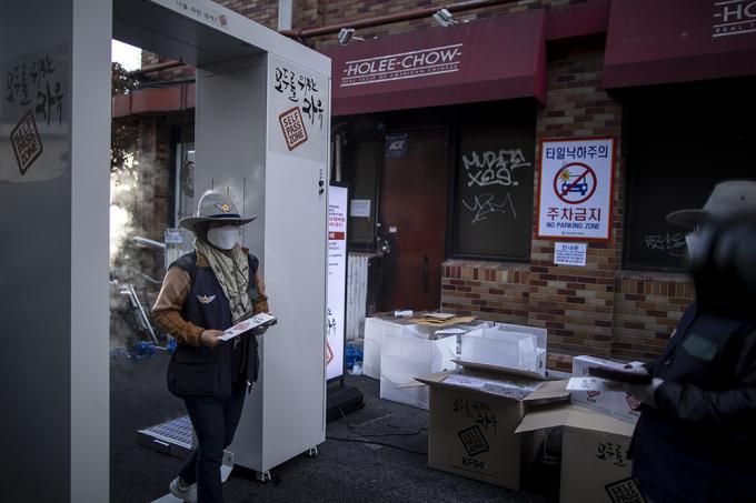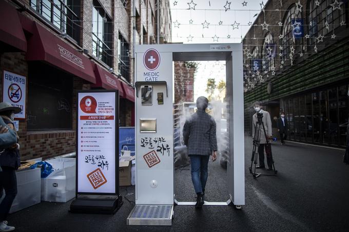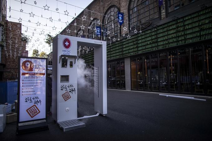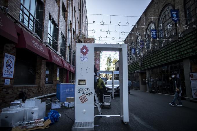 '핼러윈 데이'를 하루 앞둔 30일 오후 서울 용산구 이태원 거리에서 이태원관광특구연합회 관계자들이 방역 게이트를 설치, 운영하고 있다.