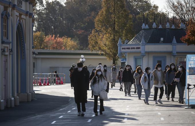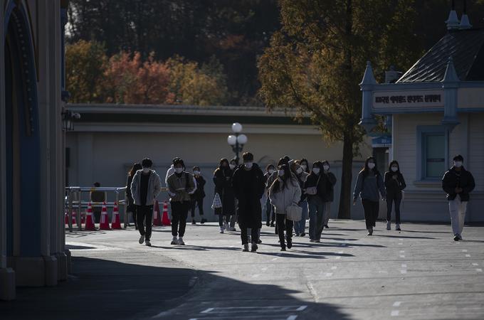 서울 아침 최저기온이 영하 1도까지 내려가는 등 추운 날씨를 보인 4일 오전 경기 용인시 에버랜드에서 직원들이 두꺼운 옷차림으로 출근하고 있다.