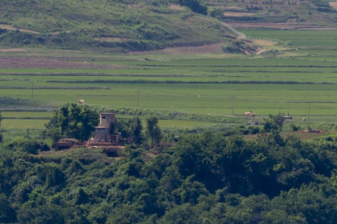 ▲ 지난 6월 19일 경기 파주 접경지역에서 바라본 북한 개풍군 선전마을에 북한군 초소가 보인다. [문재원 기자]