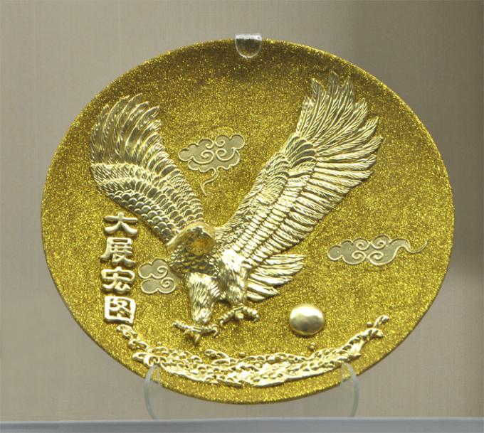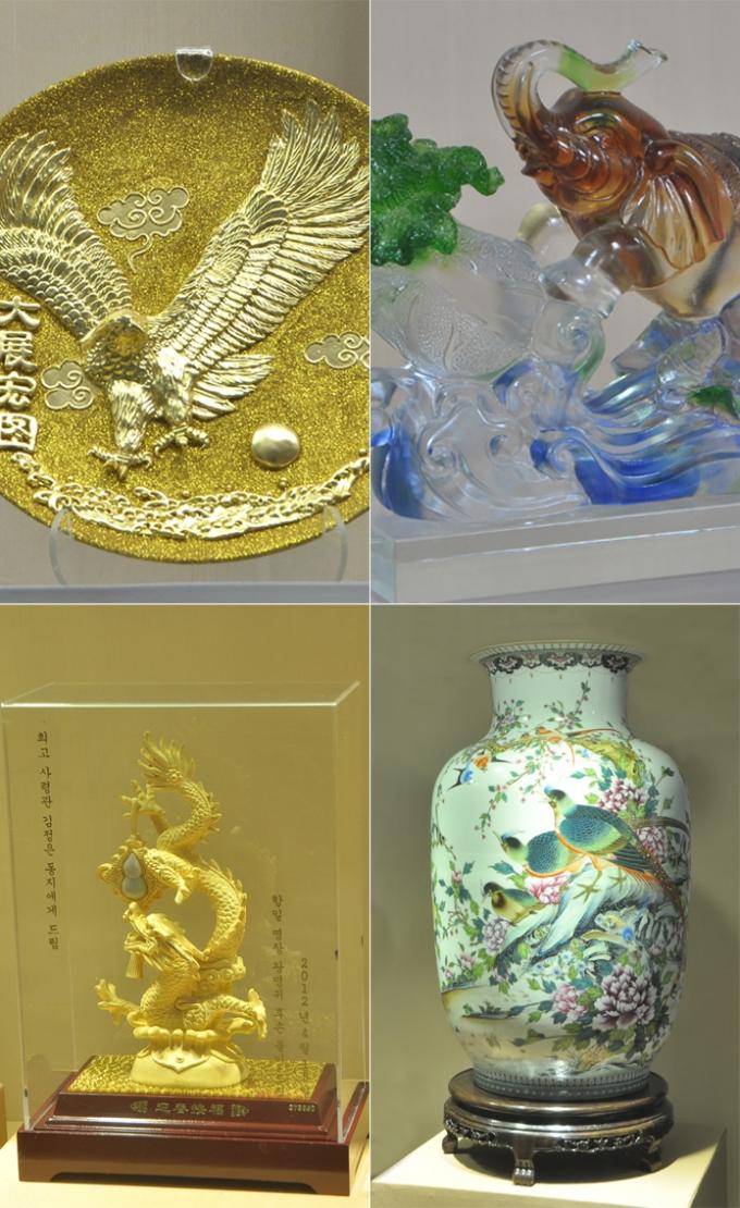 이 가운데서 특히 눈에 띄는 것은 중국 항일혁명투쟁 연고자 주보중(周保中)의 손녀 주해교가 김정은에게 선물한 '대전굉도(大展宏图)'라는 명칭의 금도금 공예품이다.