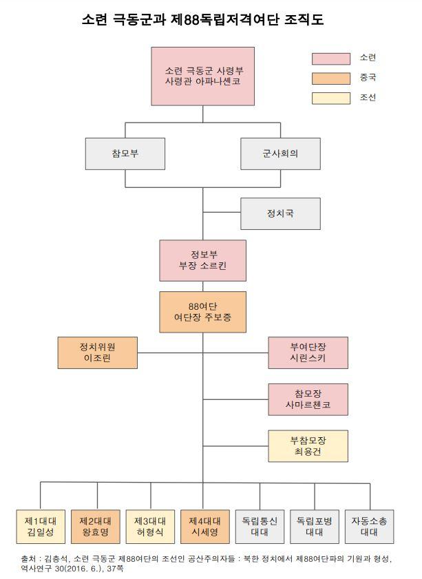 우선 88여단 조직도를 보면 편제상으로는 '소련 극동군사령부' 산하이지만 소련과 중국, 그리고 조선 출신 인사들이 균등하게 편제된 조·중·소 연합군 성격을 띠고 있음을 알 수 있다.