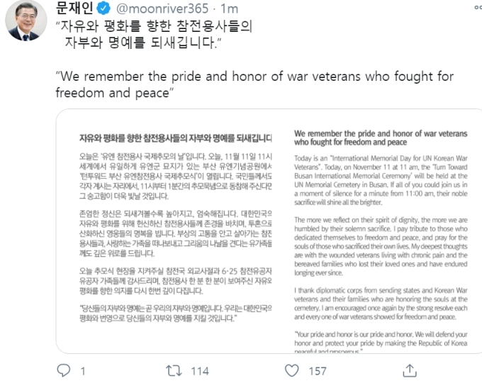 또한 문 대통령은 이날 오전 11시 부산 유엔기념공원에서 열리는 추모식과 관련해 "국민들도 각자의 자리에서 11시부터 1분간 추모묵념에 동참한다면 그 숭고함이 더욱 빛날 것"이라며 참여를 당부했다.