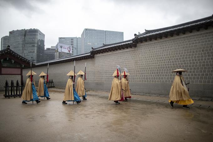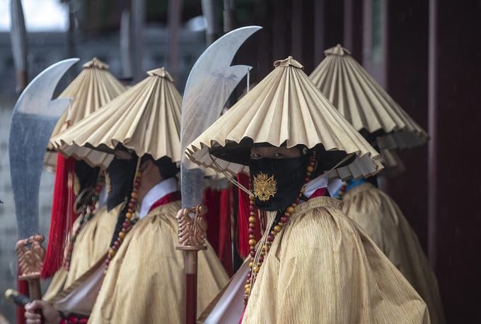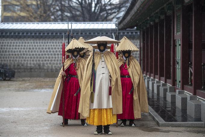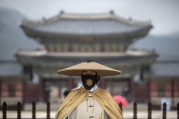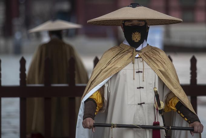 [사진 세상] 도깨비 마스크 이어 새 비옷 갖춘 경복궁 수문장