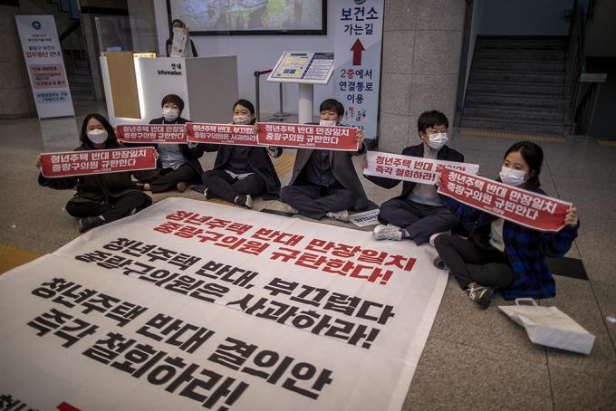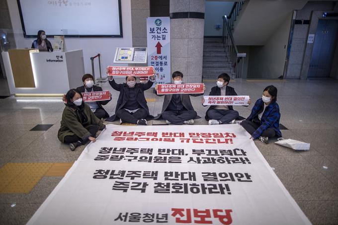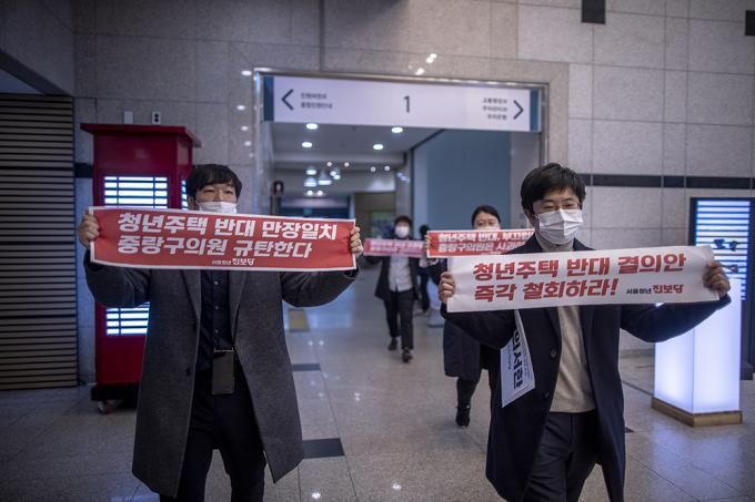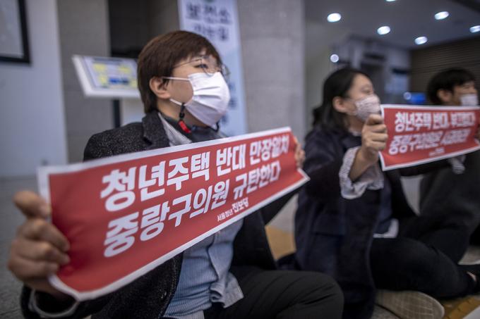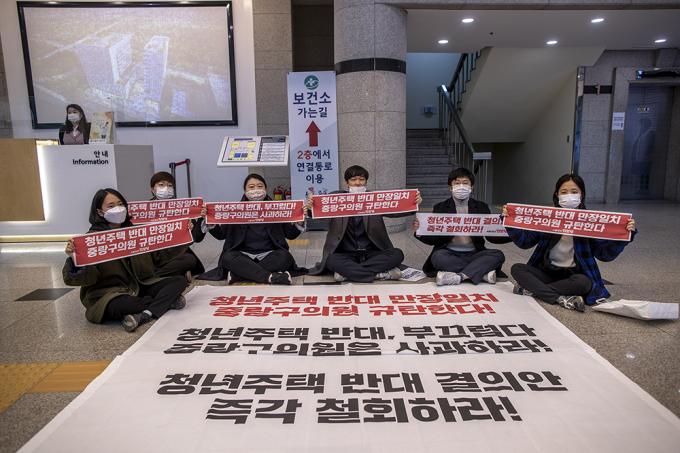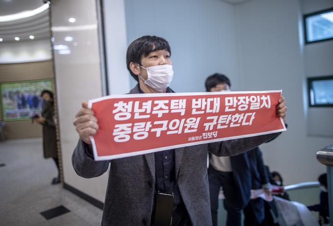 서울청년진보당 관계자들이 20일 오전 서울 중랑구청 로비에서 중랑구의회의 묵동청년주택 반대결의안 채택 철회를 촉구하며 기습시위을 하고 있다.