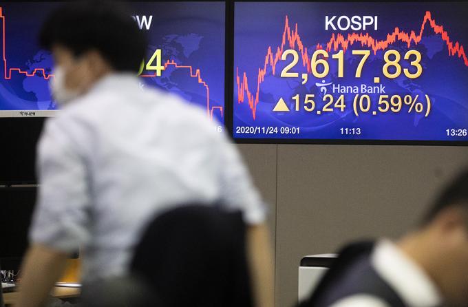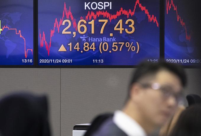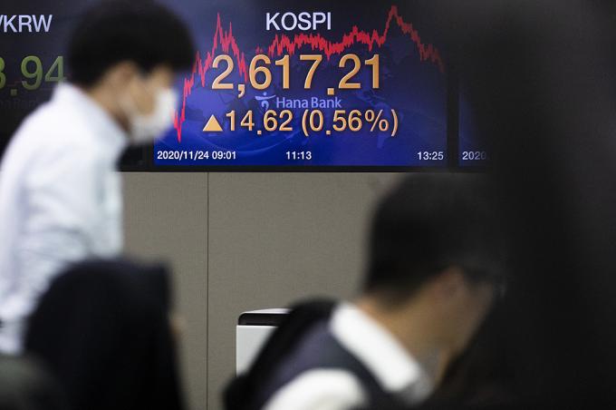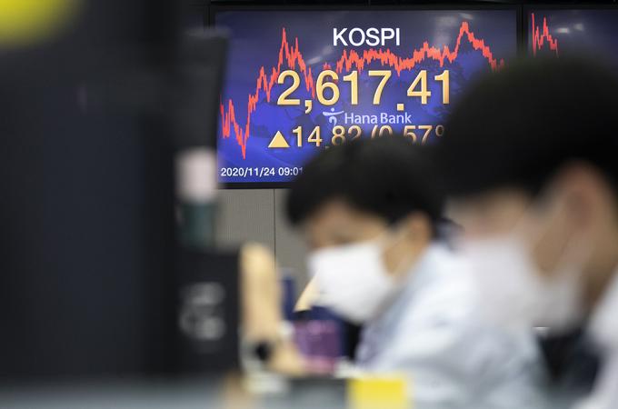 24일 오후 서울 중구 명동 하나은행 딜링룸에서 직원들이 업무를 보고 있다. 지난 23일 종가 기준 2600선을 넘어 역대 최고치를 경신한 코스피는 24일 오전 2620선을 돌파해 장중 최고치를 경신했다.