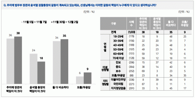 '추미애·윤석열 갈등' 책임 누가 크나…秋 38% vs 尹 18%