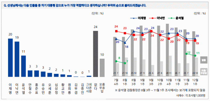 두 대권주자 다음으로 윤석열 검찰총장이 11%를 기록했다. 지난달 19일 발표된 11월 3주 차 전국지표조사 결과와 비교하면 이 지사와 이 대표의 지지율은 변함없었고, 윤 총장만 1%p 하락했다. 답변을 유보한 응답자의 비율은 34%로 직전 조사 대비 2%p 늘었다.