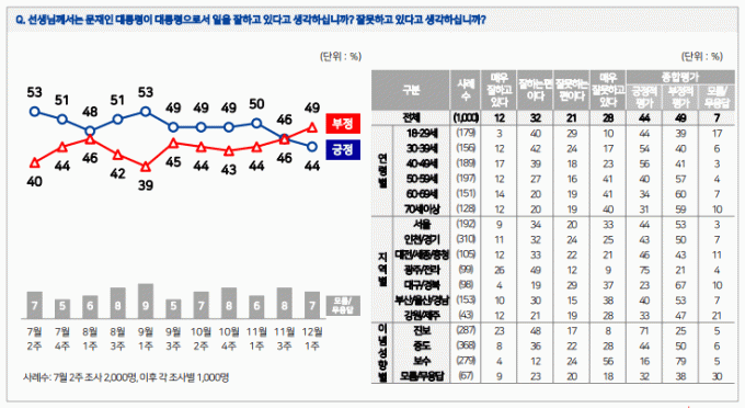 문재인 대통령의 지지율은 44%로 7월 해당 조사 시작 이후 가장 낮은 수치를 기록했다. '잘못하고 있다'고 응답한 사람은 49%였다. 정당 지지도는 민주당이 34%, 국민의힘이 22%, 정의당이 7%로 나타났다.