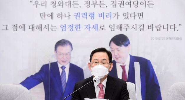 주 원내대표는 이날 당 회의에서 문재인 대통령이 전날 윤석열 검찰총장에 대한 법무부 징계위원회의 절차적 정당성과 공정성을 강조한 것에 대해서도 '명분 쌓기'에 불과하다며 비난했다.