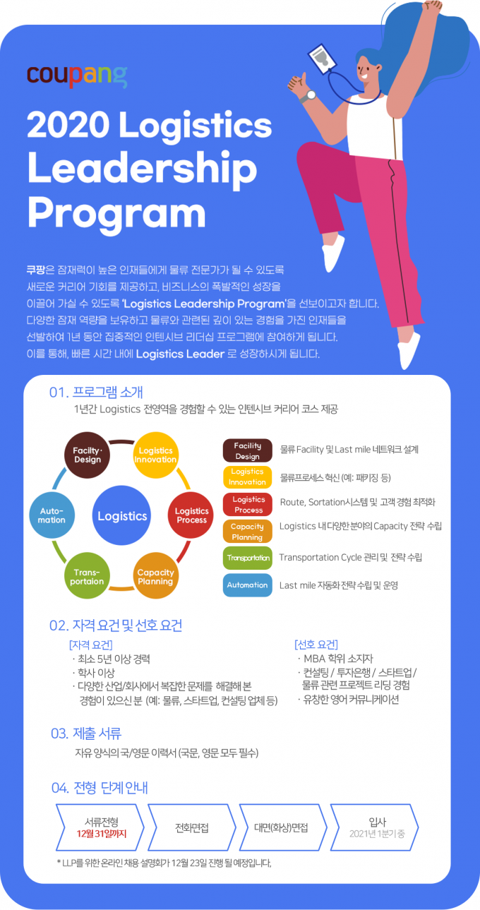 새롭게 선보이는 '로지스틱스 리더십 프로그램'은 쿠팡의 인재 양성 코스로 채용과 현장 교육이 결합된 프로그램이다. 대상자에게는 1년간 쿠팡 물류의 전영역을 경험할 수 있는 '인텐시브 커리어 코스 프로그램'이 제공된다.