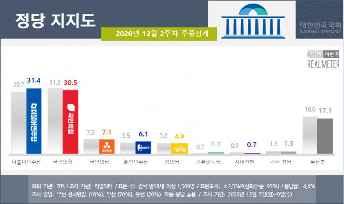 민주 31.4% vs 국민의힘 30.5%…0.9%p差