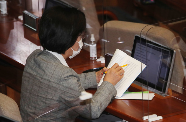 ▲ 추미애 법무부 장관이 9일 국회에서 열린 본회의에서 '내가 검찰을 떠난 이유'라는 책을 읽던 중, '총장이 자신의 자리를 지키려고 중수부를 희생시키려'라는 부분에 밑줄을 치고 있다. [뉴시스]