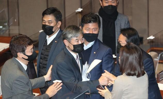 ▲ 국민의힘 조태용 의원이 11일 국회에서 열린 본회의에서 국가정보원법 전부개정법률안에 대한 무제한토론을 마치고 동료의원들의 격려를 받고 있다. [공동취재사진]