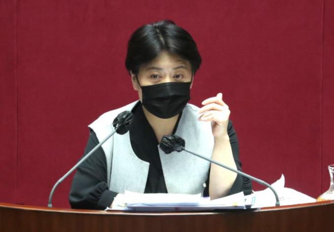 ▲ 윤희숙 국민의힘 의원이 12일 새벽 국회 본회의에서 국가정보원법 개정안에 대한 필리버스터를 하고 있다. [뉴시스]