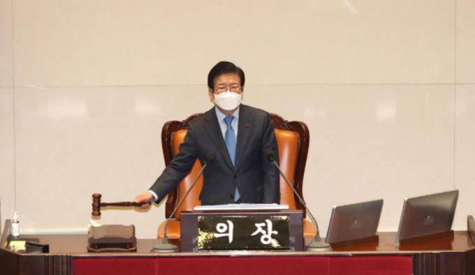 ▲ 박병석 국회의장이 12일 새벽 국회 본회의장에서 윤희숙 국민의힘 의원의 필리버스터가 끝난 후 정회를 선포하고 있다. [뉴시스]