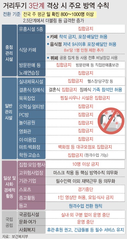 거리두기 3단계는 락다운(봉쇄) 수준의 조치다. 의료체계 붕괴 위험에 직면한 경우로 전국적 대유행시에 실시된다. 전국 주평균 확진자가 800~1000명 이상이거나 2.5단계 상황에서 더블링(두배) 등 급격한 환자 증가가 나타나는 게 요건이다. 원칙적으로 집에 머무르며 다른 사람과 접촉을 최소화해야 한다.