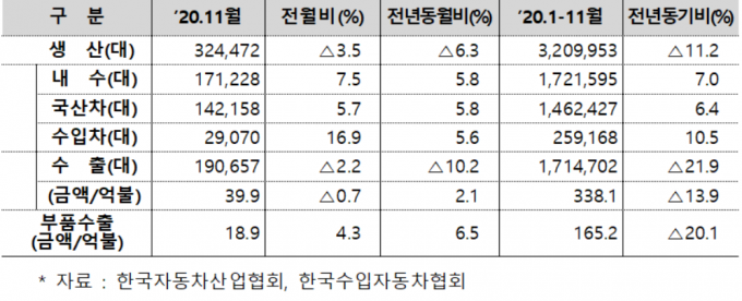 ▲ 2020년 11월 한국 자동차산업 동향 총괄표 [산업부 제공]