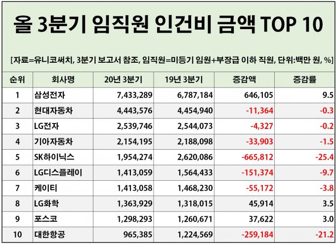 이와 달리 인건비 규모가 큰 상위 10곳 중 7곳은 그 규모가 하락한 것으로 파악됐다. 3분기 정기보고서에 의하면 SK하이닉스는 작년 2조6200억 원이던 임금 규모가 올 동기간에는 1조9542억 원으로 6658억 원(25.4%↓) 감소했다. 대한항공도 1조2245억 원에서 9653억 원으로 1년 새 2591억 원(21.2%↓) 줄었다. LG디스플레이 1513억 원(9.7%↓), 케이티 551억 원(3.8%↓), 현대차 113억 원(0.3%↓), LG전자 43억 원(0.2%↓) 순으로 인건비가 낮아졌다.