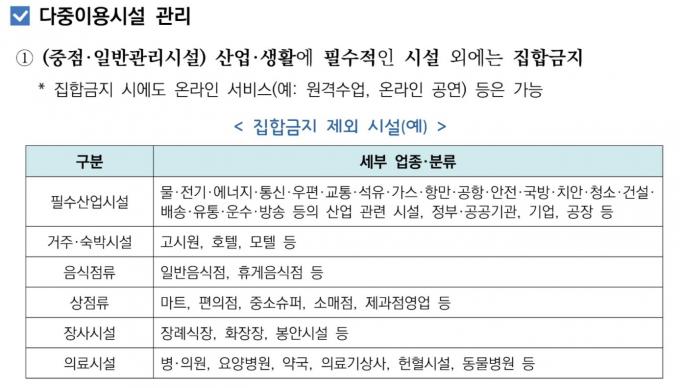 집합금지 제외 시설 예시에 마트, 편의점, 중소슈퍼, 소매점, 제과점 등이 포함됐지만, 대규모점포인 대형마트까지 포함되는 것인지는 명확히 표기되지 않았다. 대형마트 측은 정부의 세부지침 발표를 초조하게 기다리고 있다.