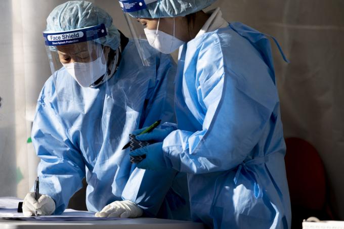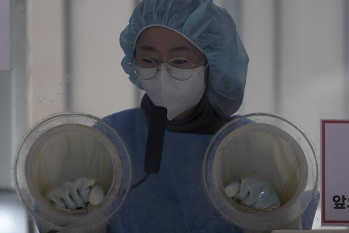 이날 오전 서울 강서구 보건소내 선별진료소. 쉴 틈 없이 밀려드는 시민들로 손 녹일 새 없는 직원이 잠시나마 핫팩을 부여잡는다. 추위를 막아주기엔 라텍스 방역 장갑은 턱없다.