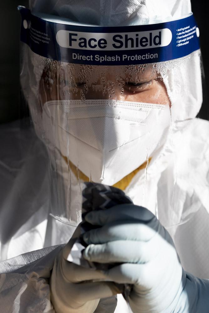 안면보호대 안쪽에 맺힌 물방울들은 보호대 벽을 흐르다 이내 얼어붙는다. 한파 속 땀과 눈물 쏟으며 바이러스와 사투를 벌이는 헌신이 느껴진다.