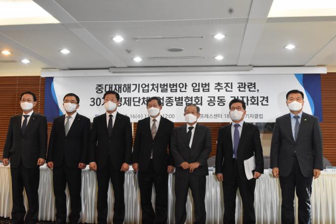 이들 단체는 16일 서울 프레스센터에서 기자회견을 열고 "헌법과 형법을 중대하게 위배하면서까지 경영책임자와 원청에 가혹한 중벌을 부과하는 중대재해법 제정에 반대한다"며 이같이 밝혔다.