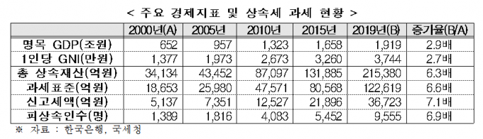 2000년부터 2019년까지 상속세가 발생되는 피상속인 수는 1389명에서 9555명으로 6.9배 증가했다. 같은 기간 과세대상 총 상속재산가액은 3조4134억 원에서 21조5380억 원으로 6.3배, 과세표준은 1조8653억 원에서 12조2619억 원으로 6.6배가 증가했다.