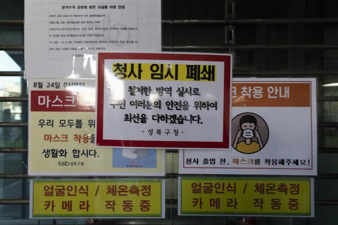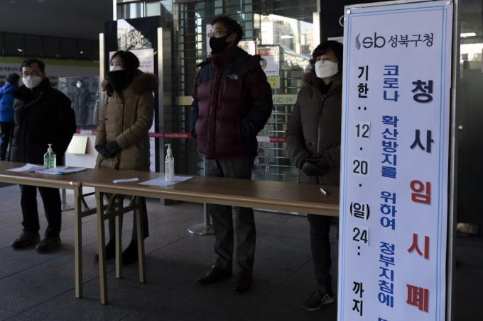 코로나19 3차 대유행이 지속되고 있는 18일 오후 서울 성북구청 입구에 임시 폐쇄 안내문이 게시돼 있다. 성북구는 구청 직원 1명이 코로나19 확진 판정을 받아 청사를 오는 20일까지 임시 폐쇄한다고 밝혔다.