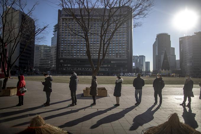 ▲ 지난 17일 오후 서울 중구 서울광장에 설치된 임시선별진료소를 찾은 시민들이 코로나19 검사를 받기 위해 거리를 두고 줄 서 있다. [정병혁 기자]