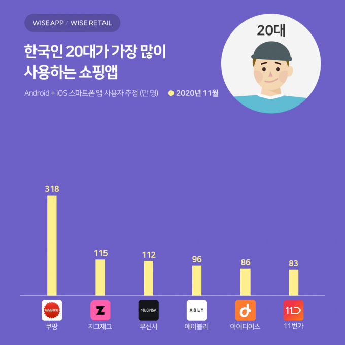 20대는 쿠팡(318만 명), 지그재그(115만 명), 무신사(112만 명), 에이블리(96만 명), 아이디어스(86만 명), 11번가(83만 명) 순으로 사용자가 많았다.