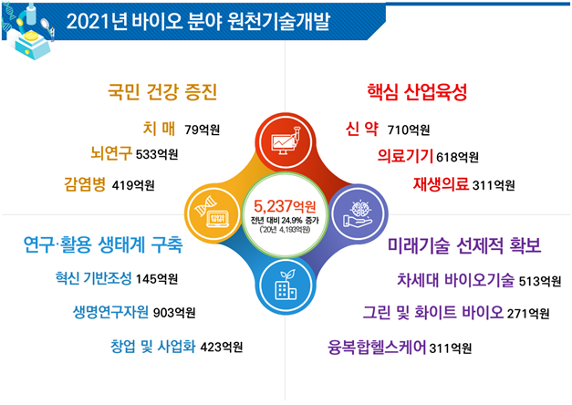 정부가 미래 성장상업인 바이오 분야 연구개발(R&D)에 내년 한 해 동안 5237억 원을 투입한다. 올해 바이오 분야 R&D 예산과 비교하면 24.9% 늘어난 규모다.