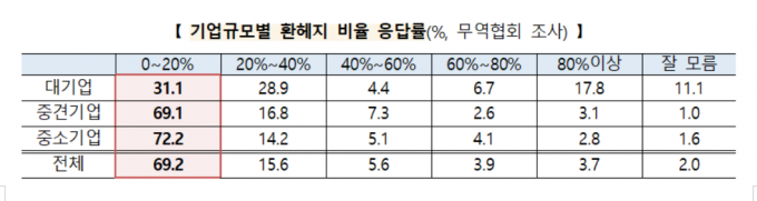 연구원이 무역협회 회원사 중 801개사를 대상으로 조사한 결과, 중견기업의 69.1%와 중소기업의 72.2%가 환헤지 비율이 0∼20%로 낮은 수준에 그쳤다.