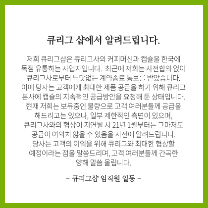 큐리그샵은 "고객에게 최대한 제품 공급을 하기 위해 큐리그 본사에 캡슐의 지속적인 공급 방안을 요청해둔 상태"라며 "협상이 지연될 시 2021년 1월부터는 이마저도 공급이 여의치 않을 수 있다"고 설명했다.