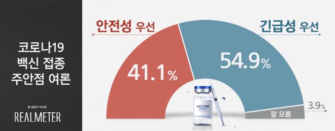 ▲ 국민의 54.9%가 코로나19 백신을 접종할 때 긴급성을 우선으로 둬야 한다고 답했다. [리얼미터 제공]