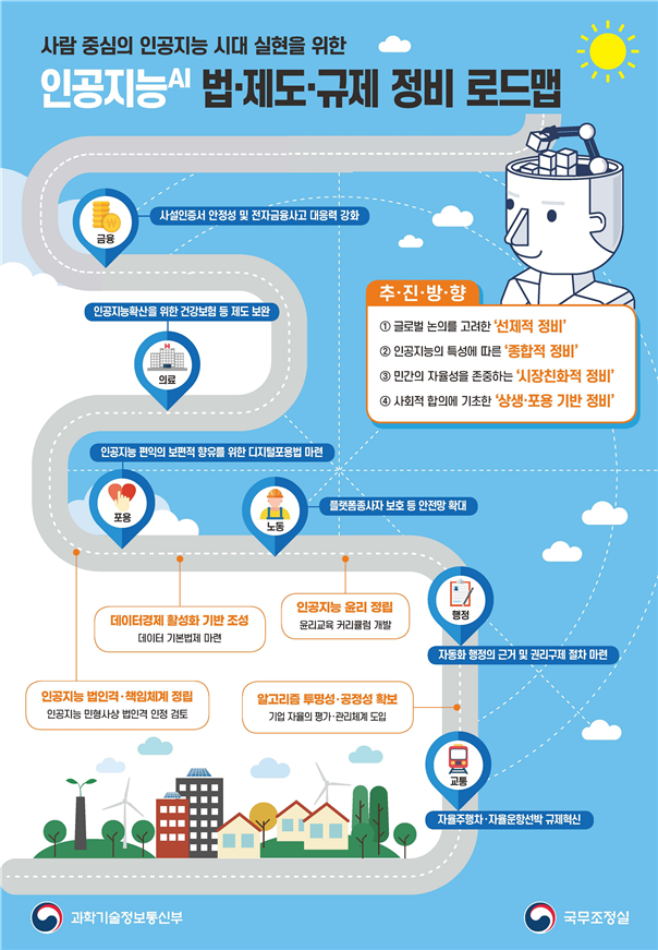 과학기술정보통신부와 국무조정실은 24일 국무총리 주재로 열린 국정현안점검조정회의에서 이러한 내용을 포함한 'AI 법·제도·규제 정비 로드맵'을 확정 발표했다고 밝혔다.