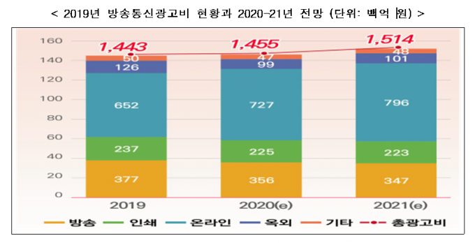 조사에 따르면 2019년 기준 국내 방송통신 광고비는 전년 대비 4.9% 증가한 14조4269억 원이었다.