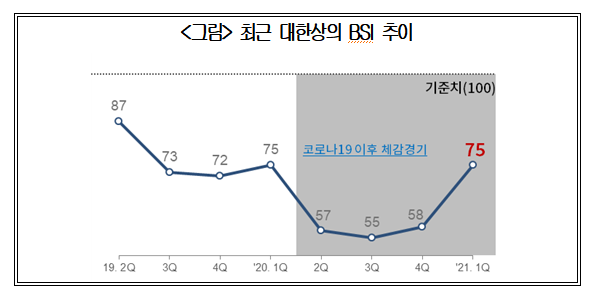 이어 "체감경기 지수가 큰 폭으로 회복된 것은 다행이지만 이것을 코로나 터널에서 빠져나오고 있다는 신호로 해석하는 것은 무리"라며 "코로나 적응력이 지금보다 부족했던 시기에 대한 기저효과도 작용했음을 인지해야 한다"고 덧붙였다.
