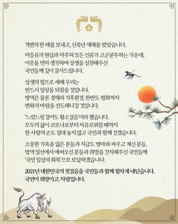 문 대통령은 1일 사회관계망서비스(SNS)에 올린 신년 메시지를 통해 "격변의 한 해를 보내고, 신축년 새해를 맞았다"며 이같이 밝혔다.
