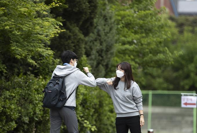▲ 선생님과 팔꿈치 인사를 하는 고등학생의 모습 [정병혁 기자]